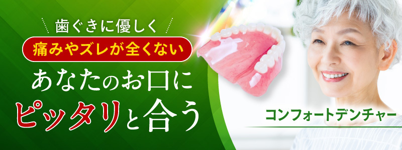 私どもがご提供している「コンフォートデンチャー」は、素材に生体用シリコンを用いた入れ歯です。歯ぐきにやさしいソフトなクッション性が特徴で、装着時の痛みを抑えた快適な使用感が得られます。