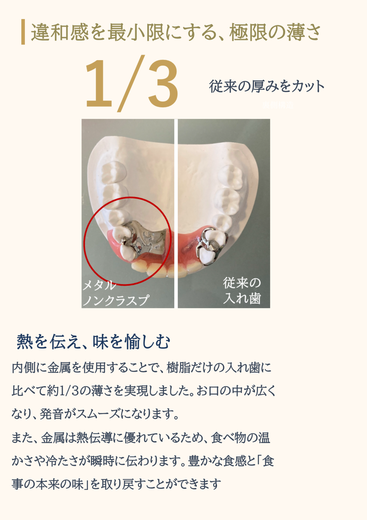 歯ぐきに接する面は柔らかい感触でありながら密着性が高く、外れにくく自然な噛み心地を実現。お食事の際に、その快適さを実感いただけるのではないでしょうか。