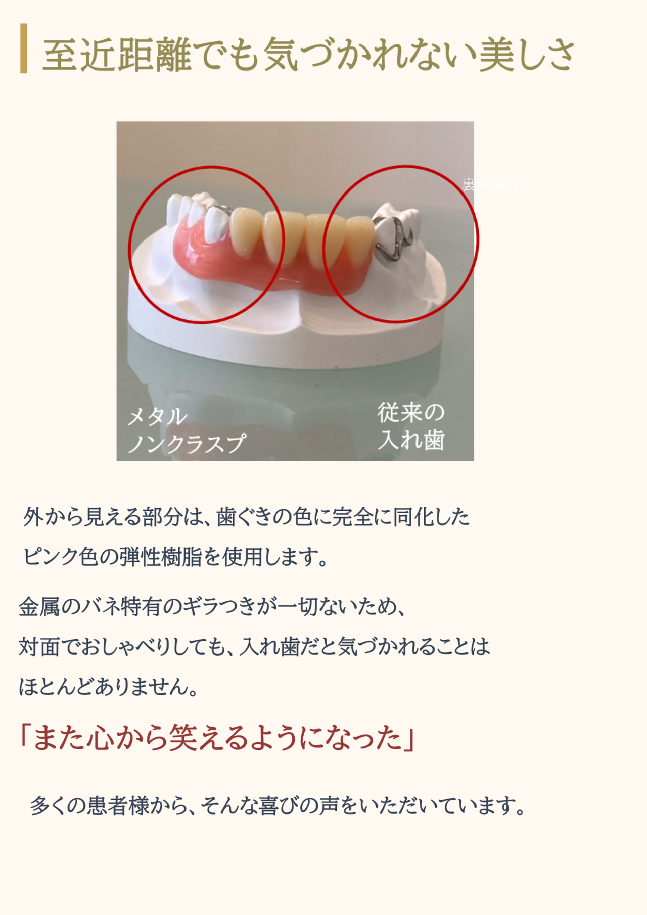 一般的な部分入れ歯は、残っている歯に留め金(クラスプ)をかけて固定する仕組みで、口を開けた際に金属が見えてしまうことがあります。