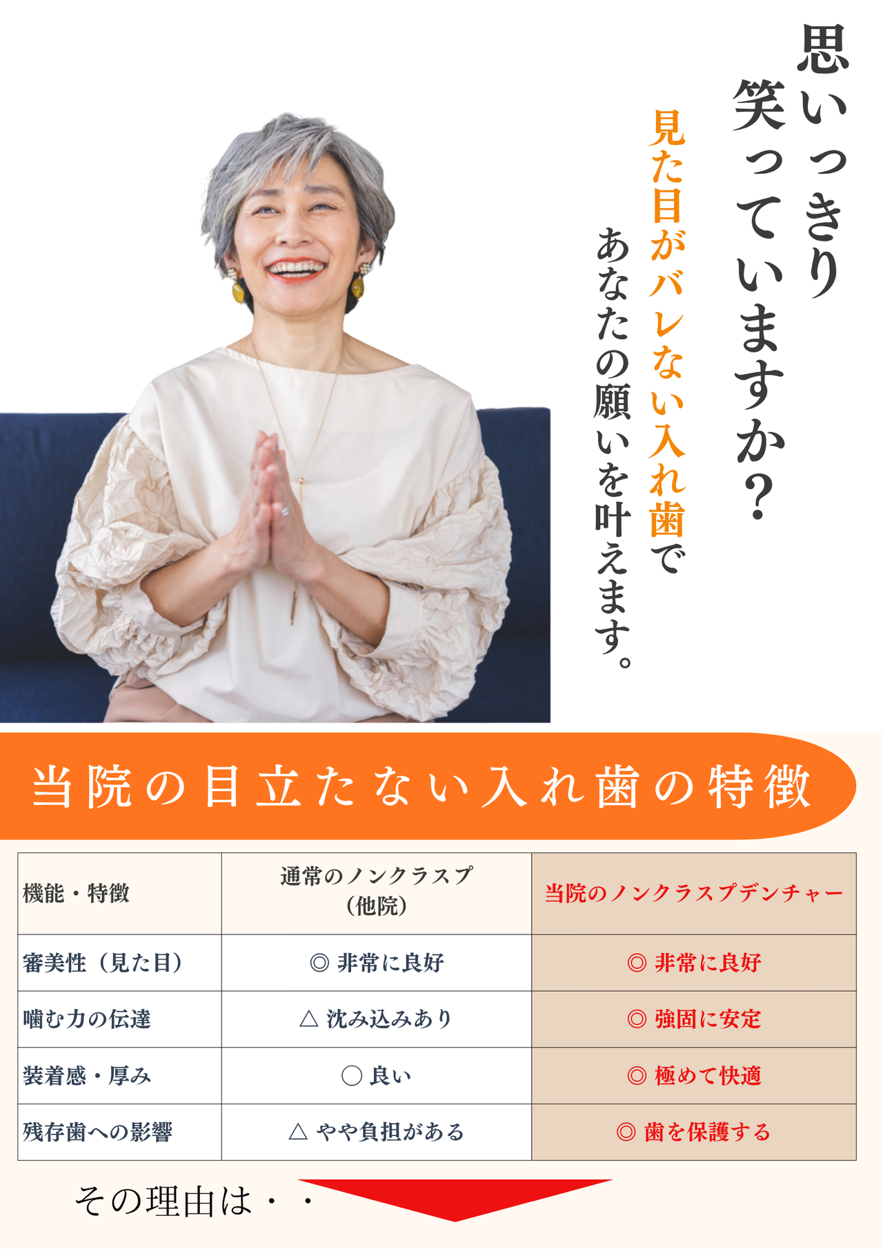 一方、ノンクラスプデンチャーはクラスプを使用しません。そのため、入れ歯だと気づかれにくく、会話や食事の際も周囲の目を気にせずお過ごしいただけます。
