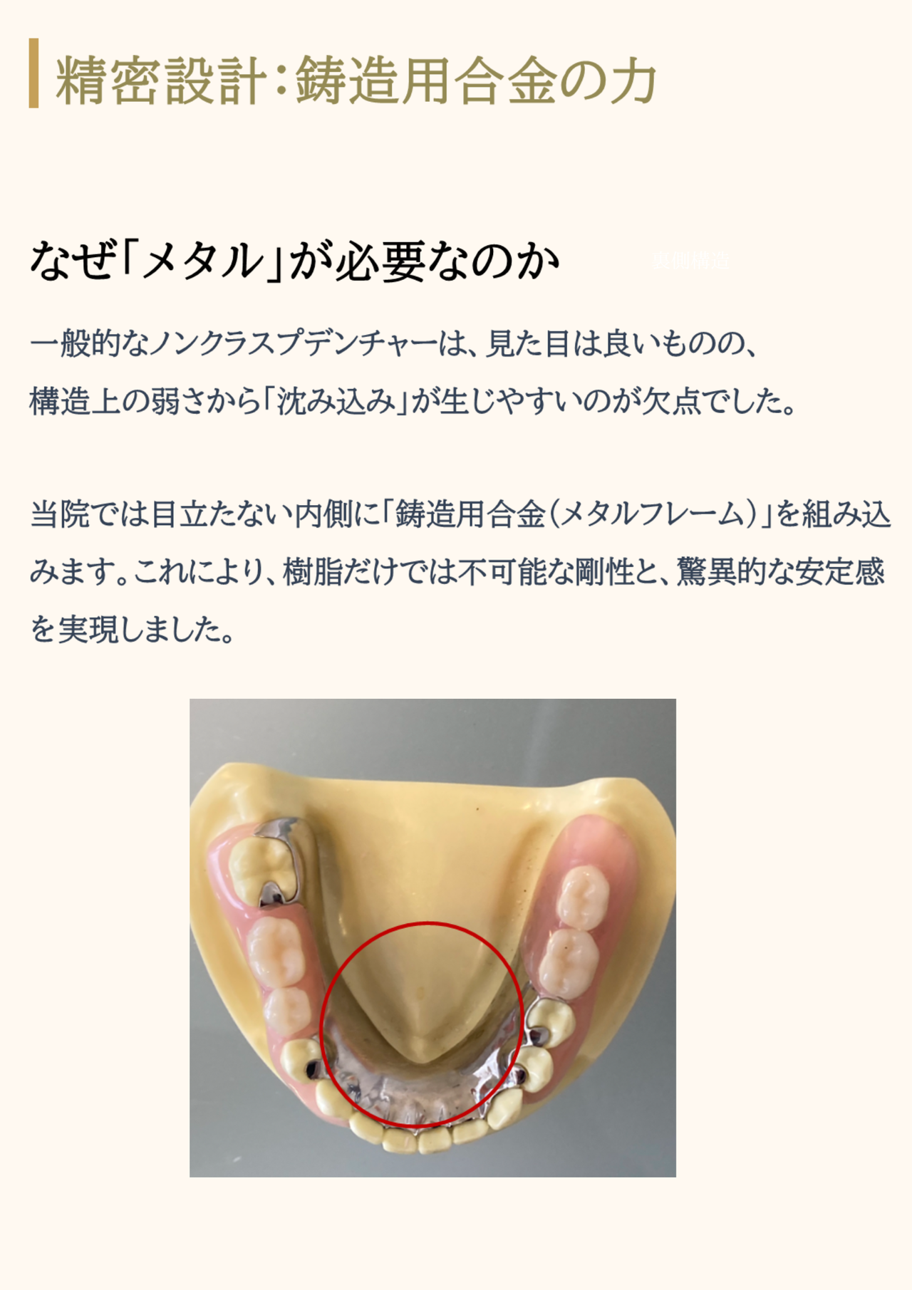 また、当院では表からは見えにくい部分に金属を組み込むことで、しっかり噛める丈夫さも兼ね備えています。